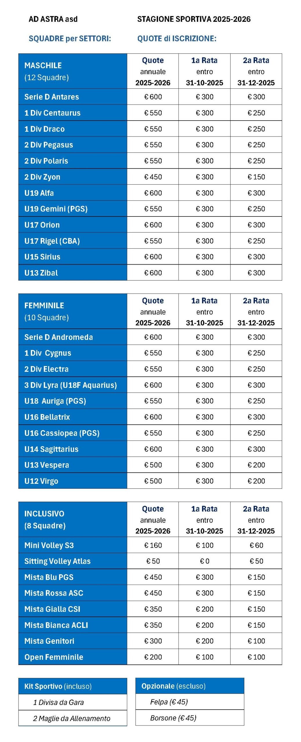 Seleziona qui sotto e visualizza le Quote annuali di Iscrizione, in funzione della tua squadra di appartenenza: